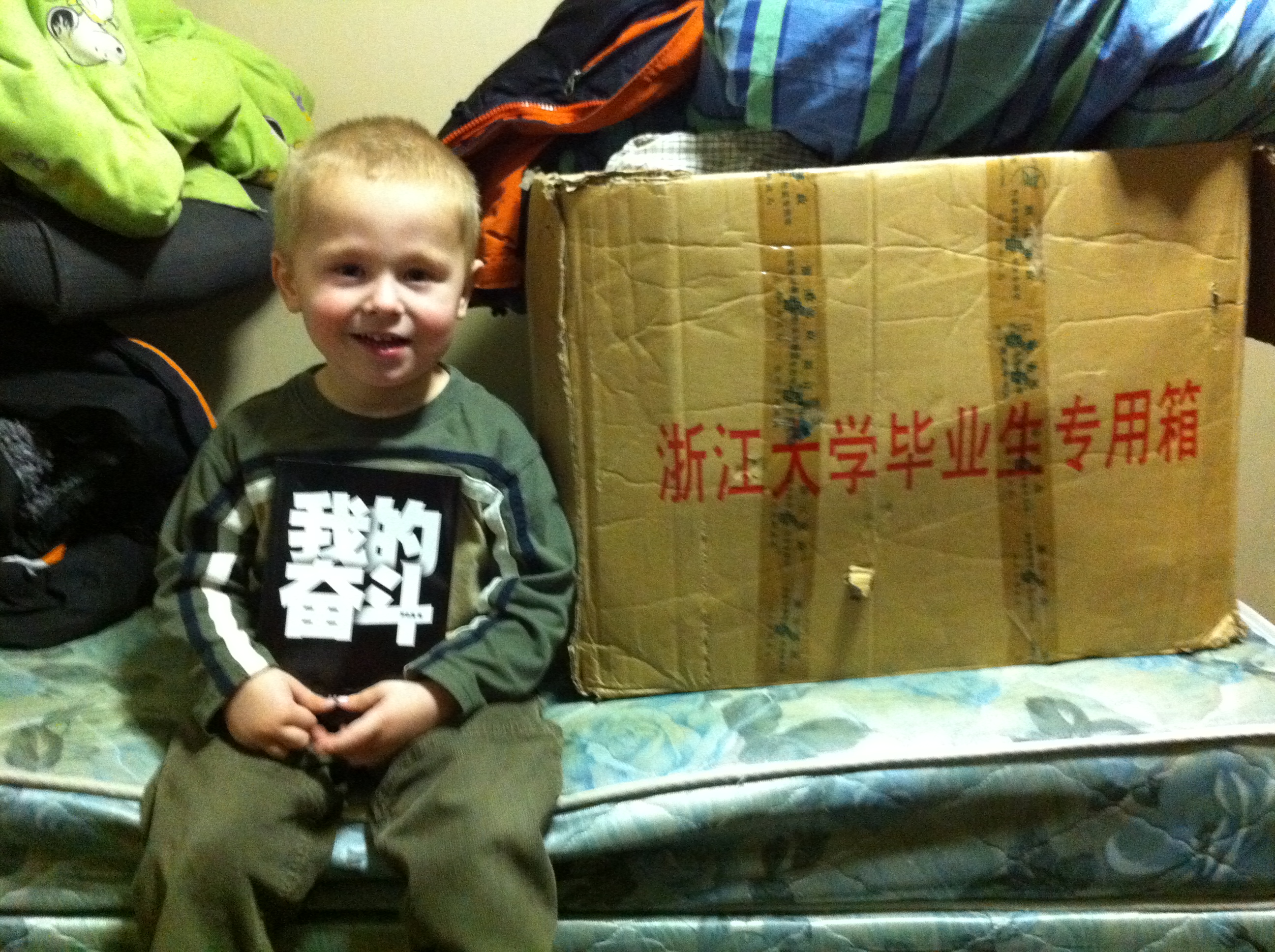 Landlord’s son with 老罗‘s book and stuff ZJU’s alumni should understand.. -Lansing MI, Dec 2010